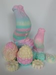 Size difference between SlicksDicks Xenova, Frisky Beast Brood Egg, Kuduvoodoo Beast Seed, and Monster Maxim Bantam Egg.